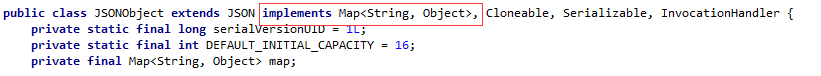 我们可以把JSONObject 当成一个 Map<String,Object> 来看,只是 JSONObject 提供了更为丰富便捷的方法,方便我们对于对象属性的操作。我们看一下源码。