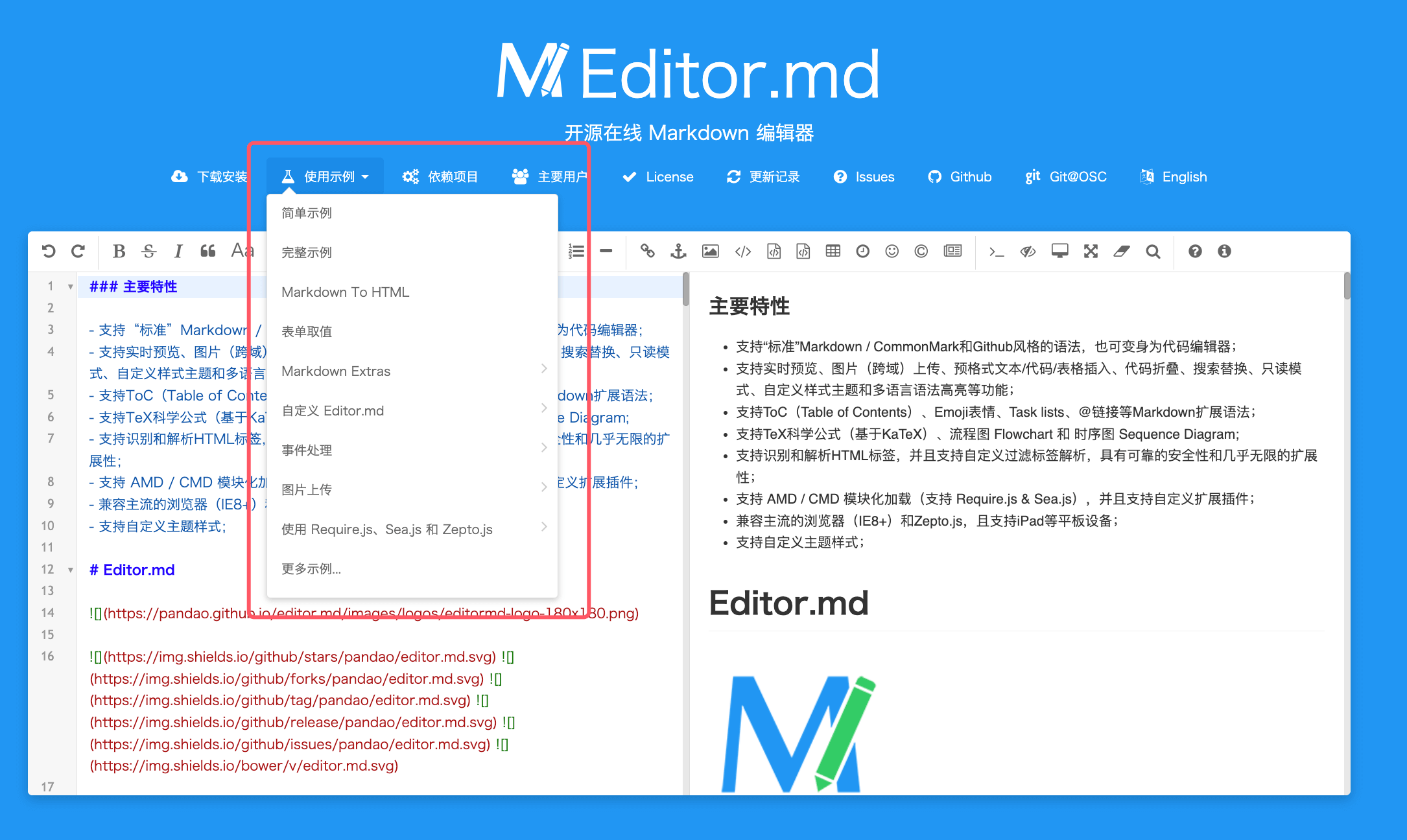 Editor.md 具备了以下特性: