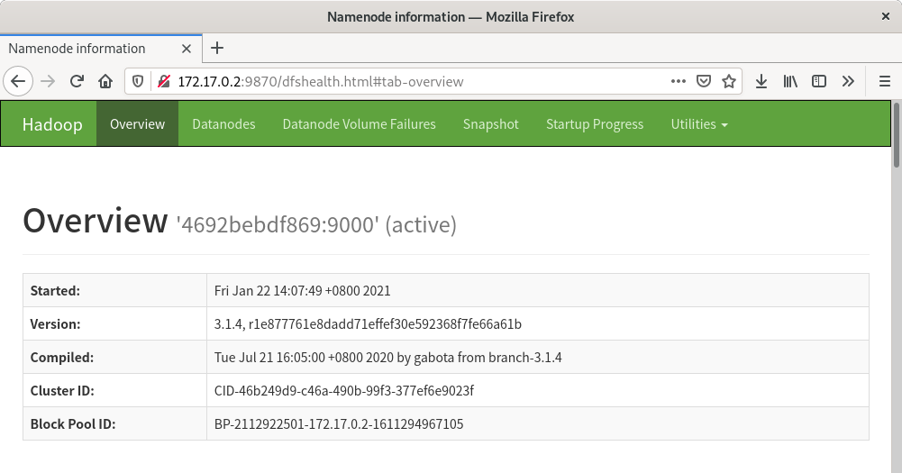 到此为止,HDFS 守护进程已经建立,由于 HDFS 本身具备 HTTP 面板,我们可以通过浏览器访问http://你的容器IP:9870/来查看 HDFS 面板以及详细信息: