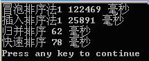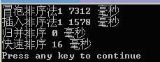 在本人电脑上对冒泡排序,直接插入排序,归并排序及直接使用系统的 qsort() 进行比较(均在 Release 版本下)。