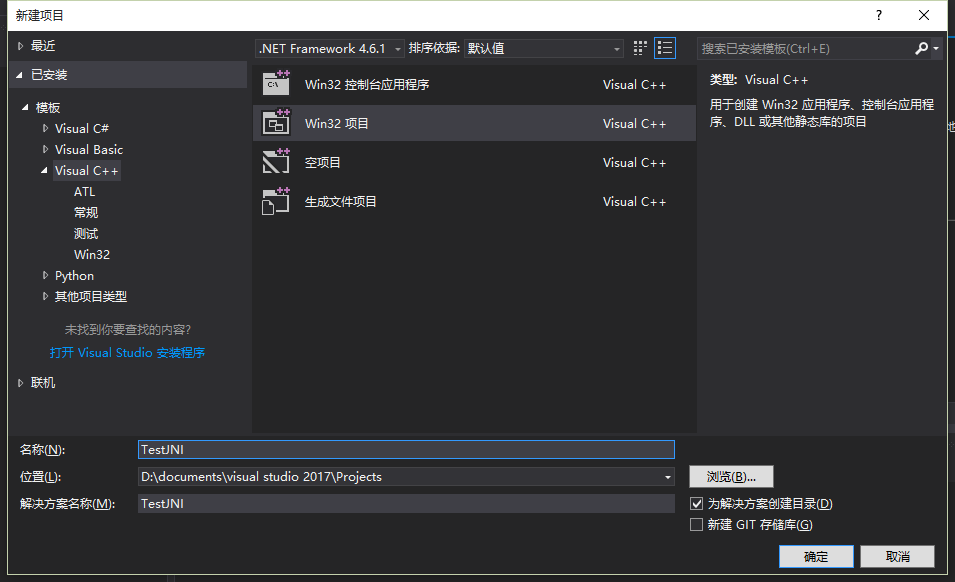 2.选择(Win32),输入项目名称,项目地址,点击确定。