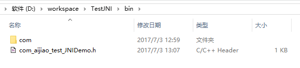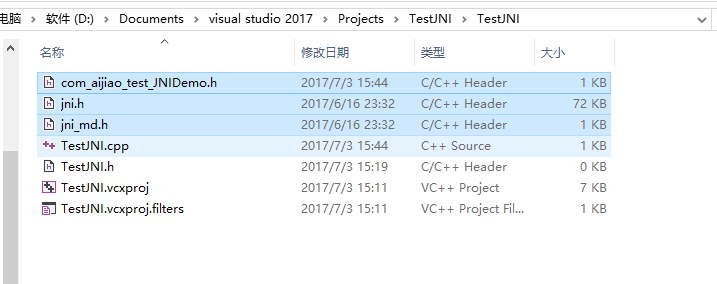 9.在你的JDK目录的include目录下有一个jni.h的文件,include的win32目录下有个jni_md.h文件,还有java工程的bin目录下的C头文件,一起拷贝到C工程的TestJNI目录下:(当前工程名就叫TestJNI,工程目录下还有一个TestJNI目录,工程目录-》TestJNI-》jni.h com_aijiao_test_JNIDemo.h jni_md.h)如下图: