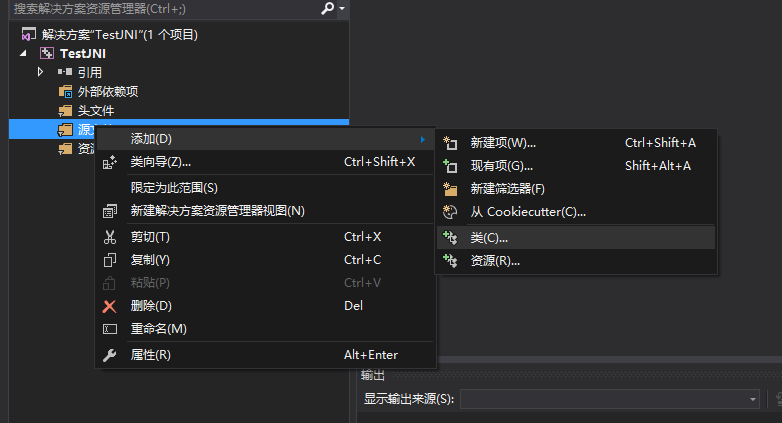 6.在源文件的文件夹上面右键,选择添加-》类。