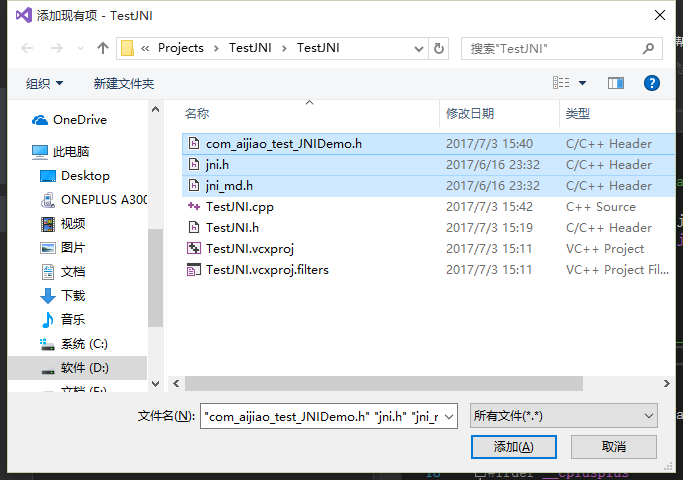 11.选择jni.h,com_aijiao_test_JNIDemo.h和jni_md.h