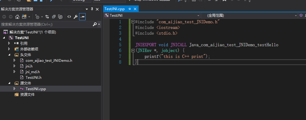 14.在TestJNI.cpp文件中写入如下代码:
