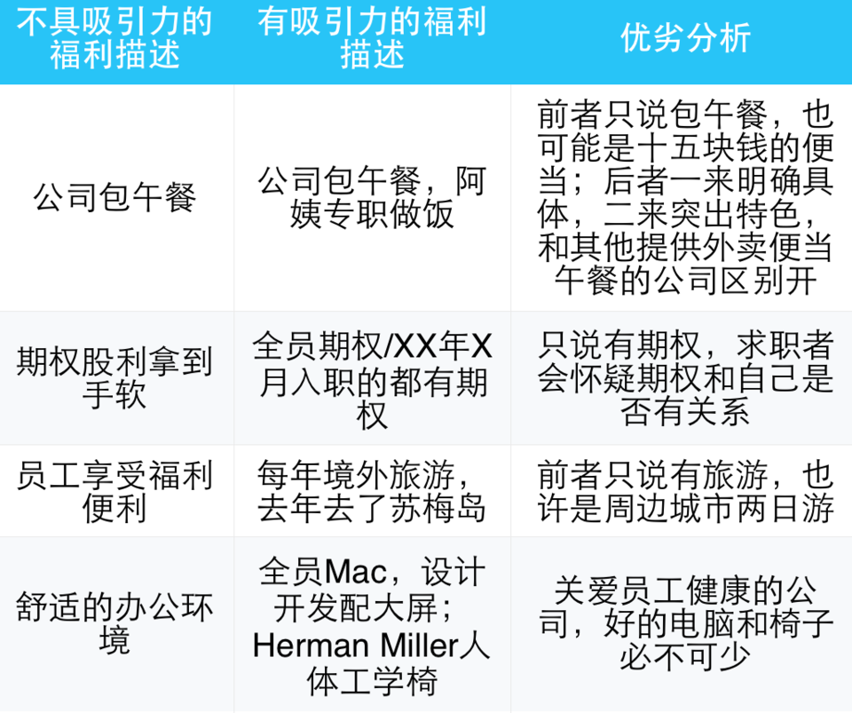在高端程序员招聘这个买方市场里,薪资福利部分的撰写十分重要。尤其是员工福利的描述,切记「明确具体、突出特色」八字诀窍。