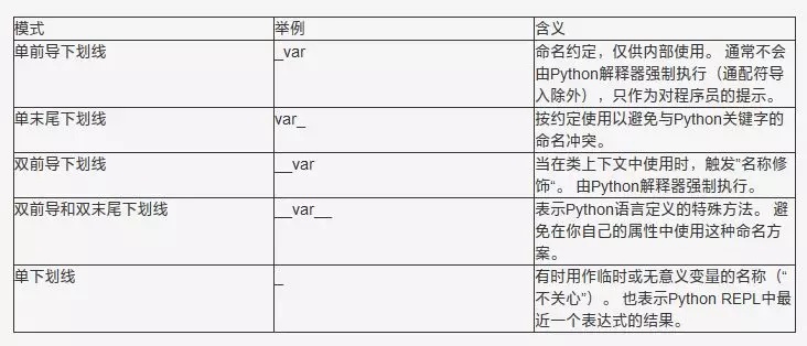 以下是一个简短的小结,即"速查表",罗列了我在本文中谈到的五种Python下划线模式的含义: