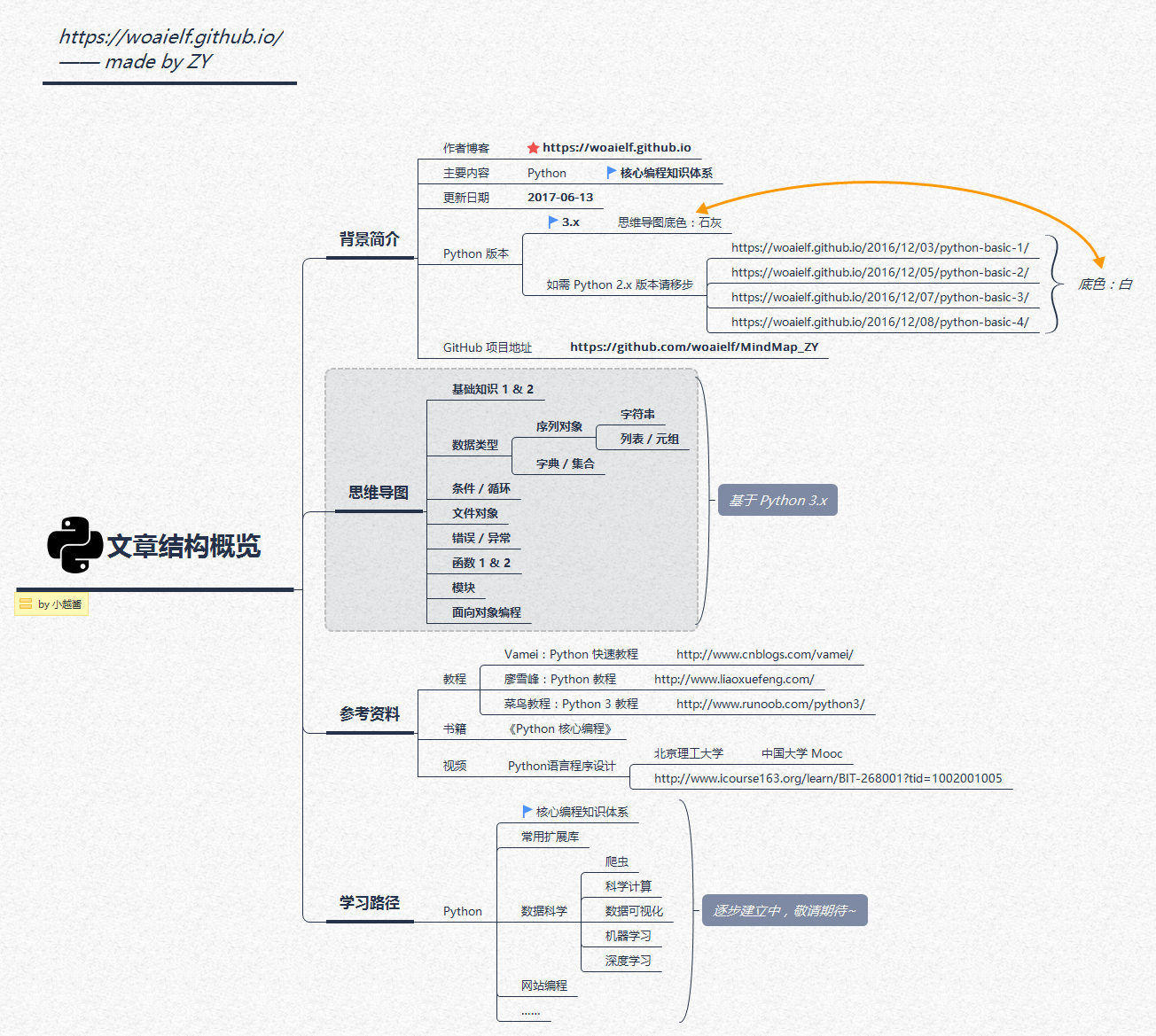 小越酱,某医学院研二小硕一枚,热爱思维导图及数据科学,梦想着毕业后能从事数据相关的工作。个人博客:https://woaielf.github.io ,不定期分享思维导图笔记,待某一话题积累足够多的笔记后,便集结成文。(比如本文~)若有朋友欲先览为快,可到博客一游哦。成熟的思维导图会分享于 GitHub 项目中:https://github.com/woaielf/MindMap_ZY ,欢迎 fork,顺手点个 star 就更棒啦~感谢~
