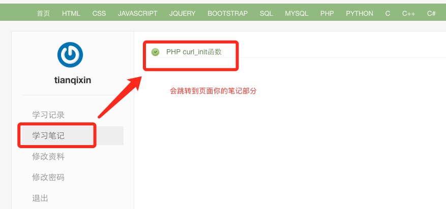 已登陆用户可以在文章底部记录个人的学习笔记,笔记提交后,需要后台管理员审核,优质的笔记会分享给其他小伙伴阅读,在个人中心后台你也可以查看你的所有笔记记录,界面如下。