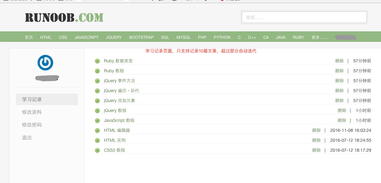 用户中心目前功能点比较少,较多人反馈的是需要个人的学习记录,目前只提供10条记录,超过部分会自动替换。