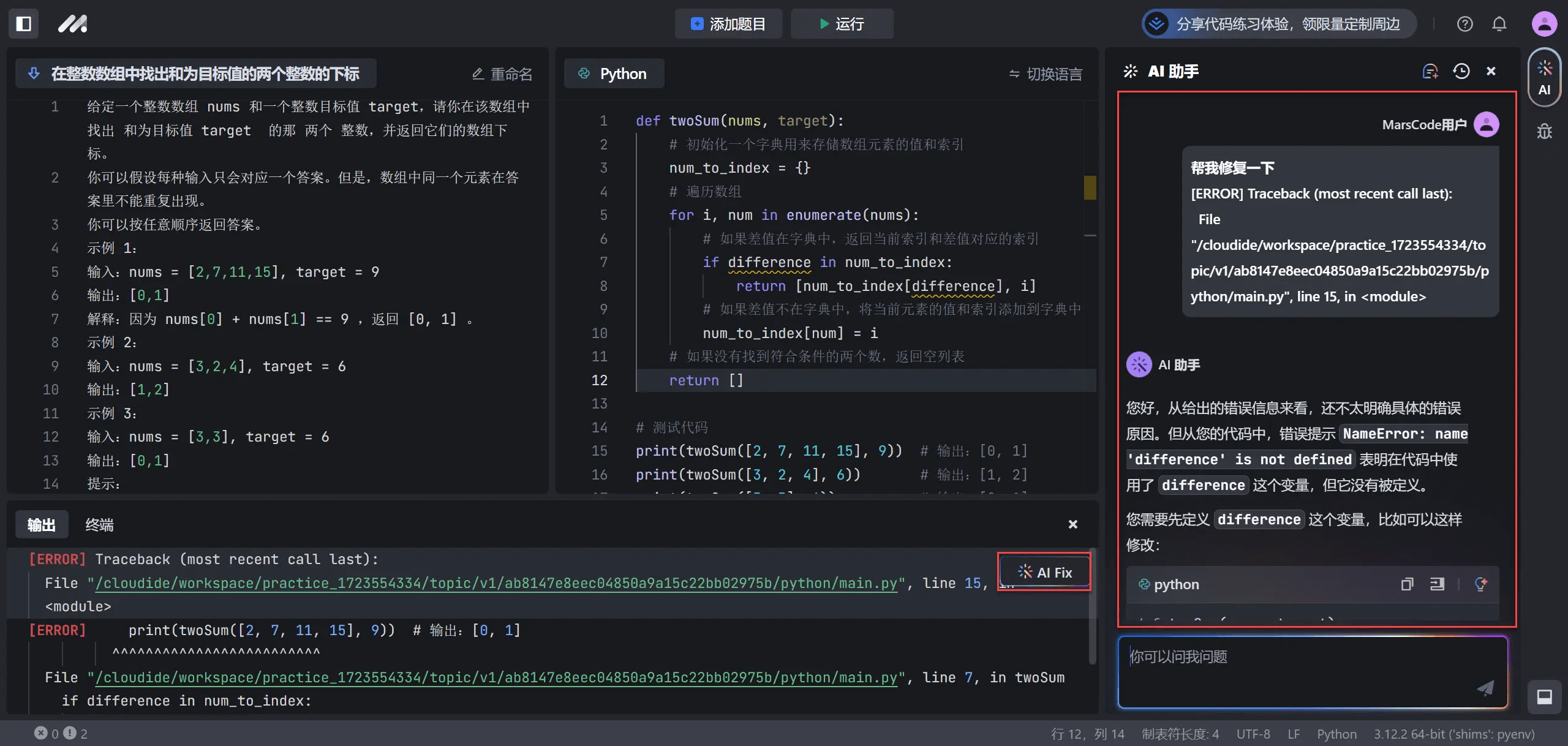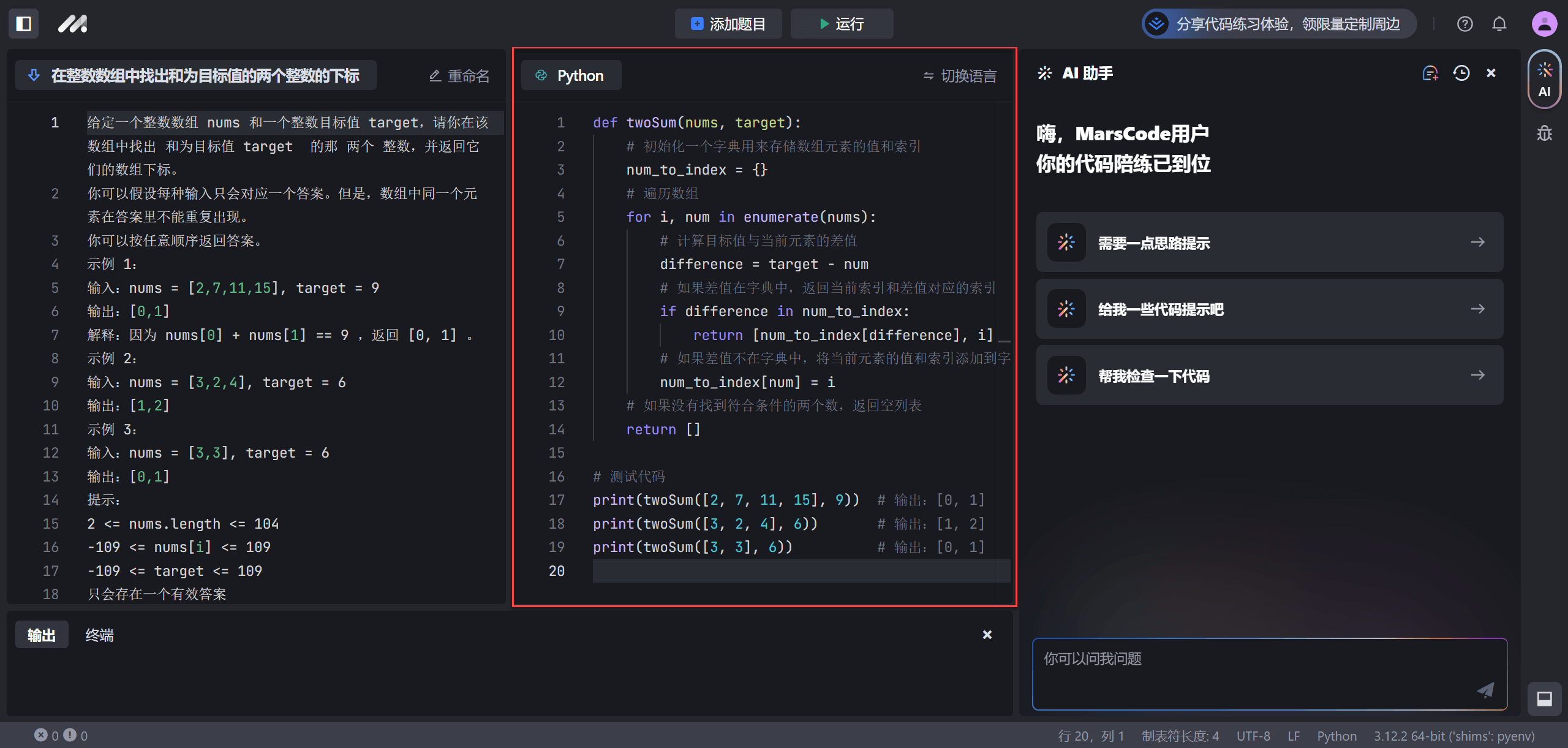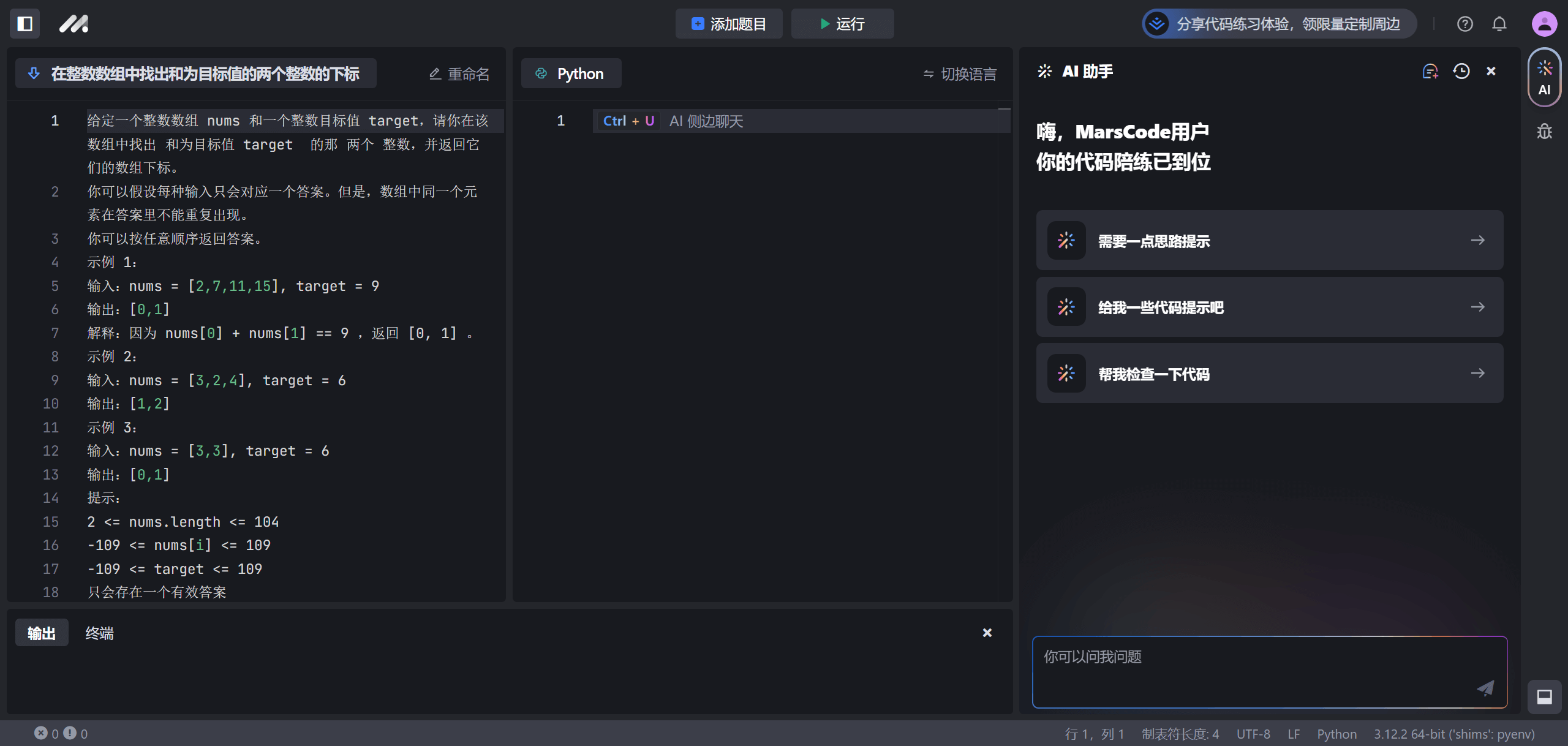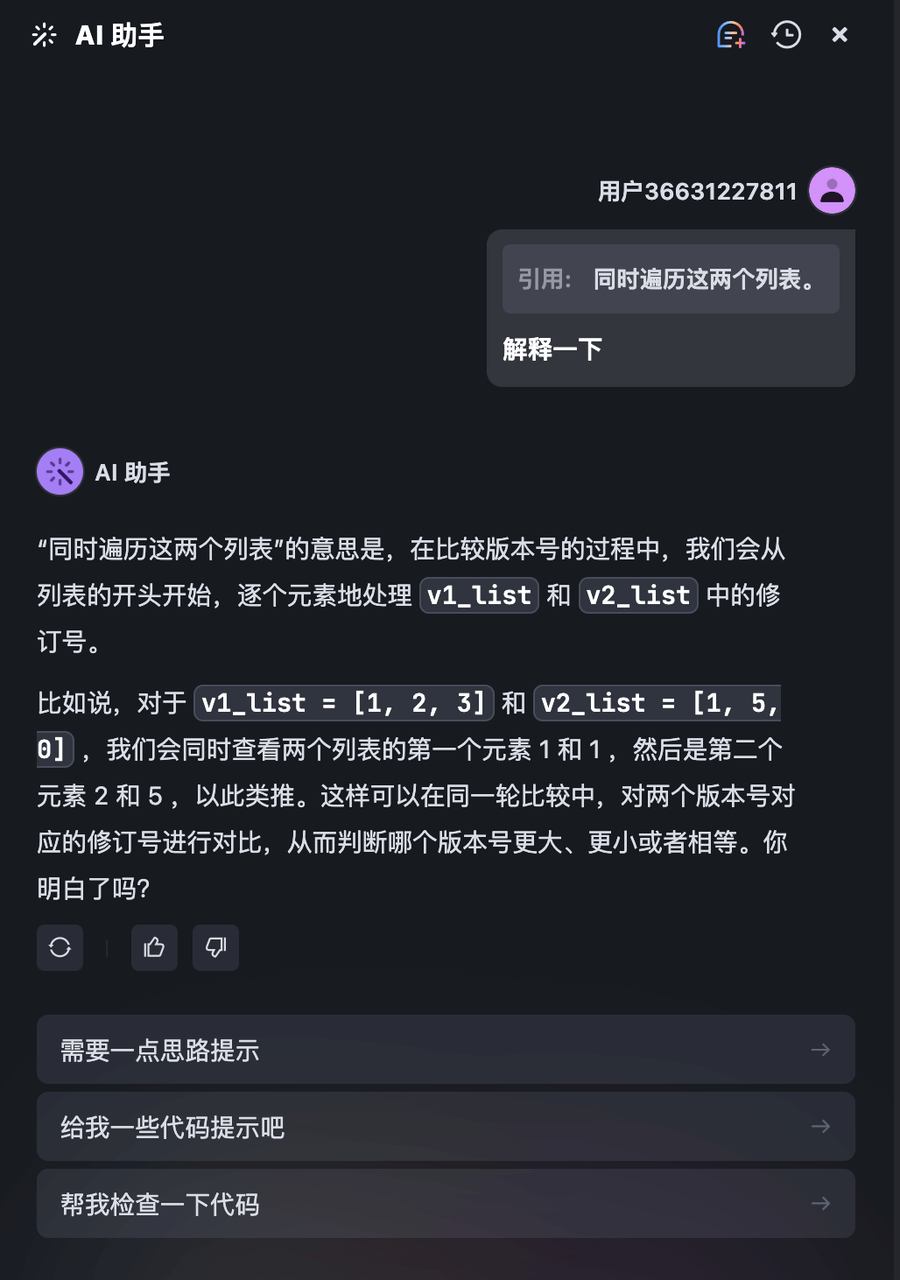 MarsCode AI 助手可以为你提供解答思路或代码提示,也可以帮助你检查代码。