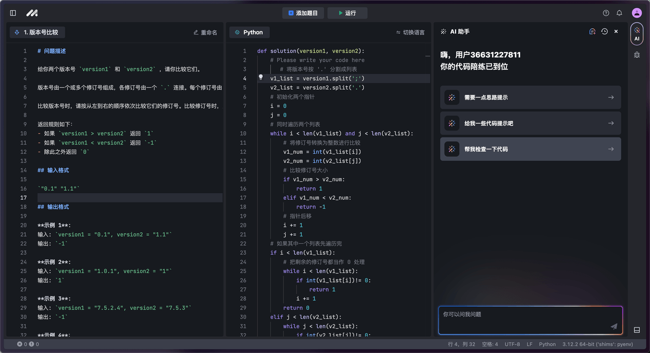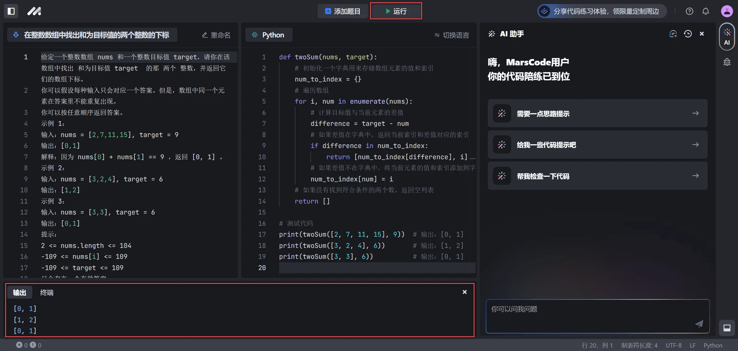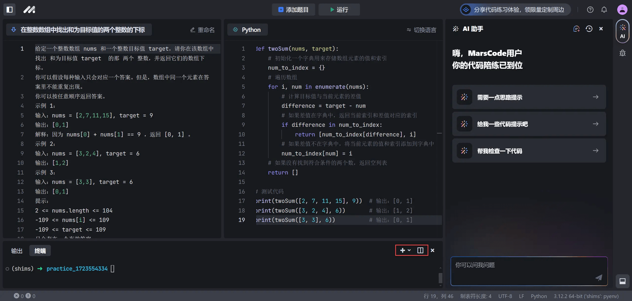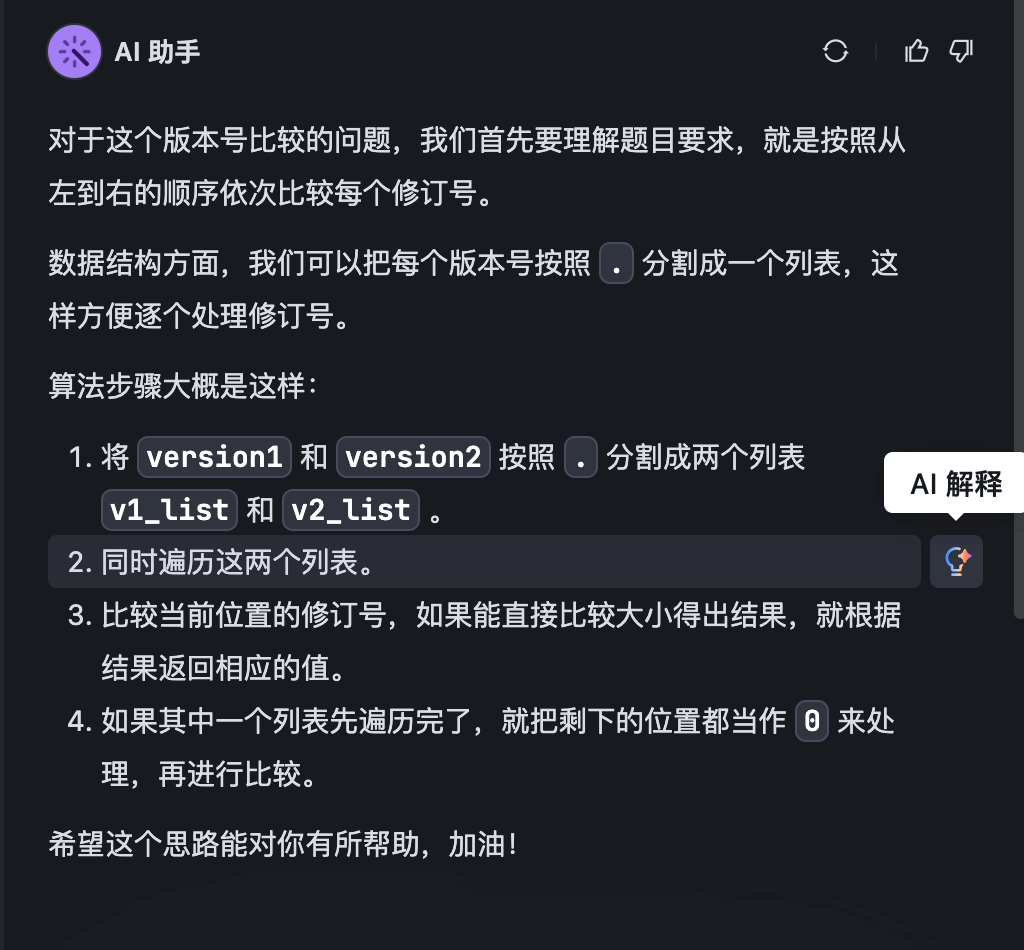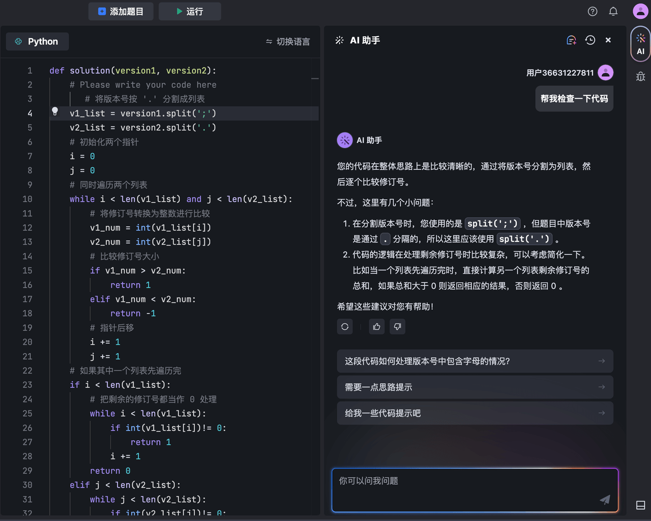 MarsCode AI 助手可以为你提供解答思路或代码提示,也可以帮助你检查代码。