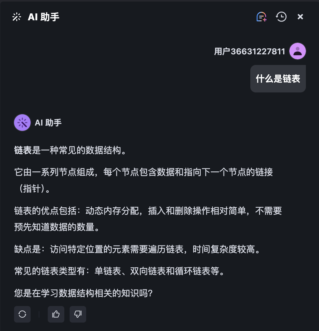 答题过程中,若需要 AI 助手的帮助,可点击右侧边栏顶部的 AI 按钮,打开 AI 助手聊天框,然后点击相应的按钮,获取思路提示和代码提示或让 AI 助手检查你所输入的代码。