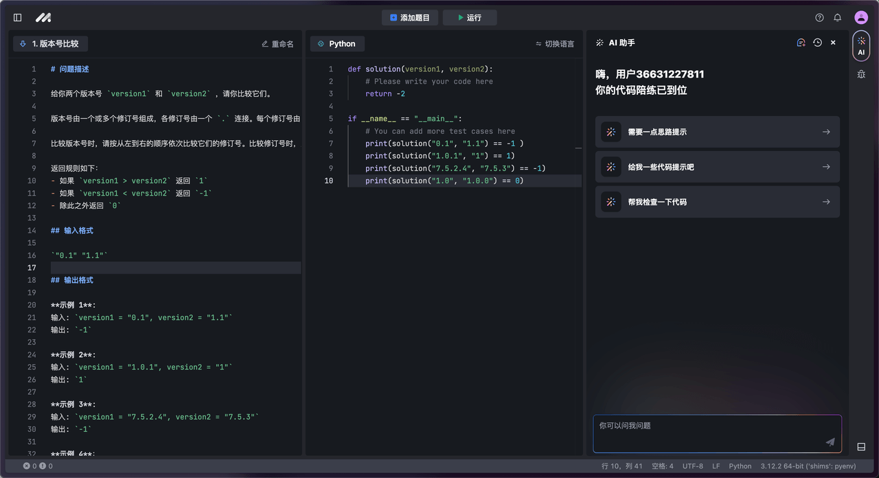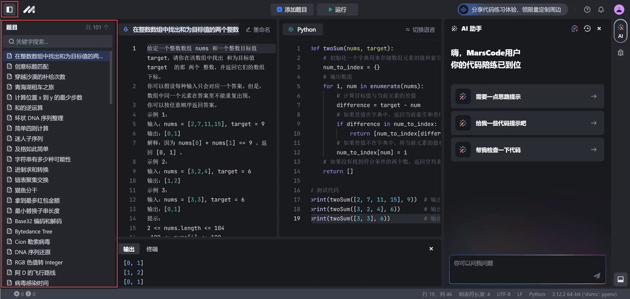 豆包MarsCode(代码练习版)已内置 100 道题目,大厂历年真题,区分了简、中、难三档题目,你可以使用这些题目来练习编程能力。