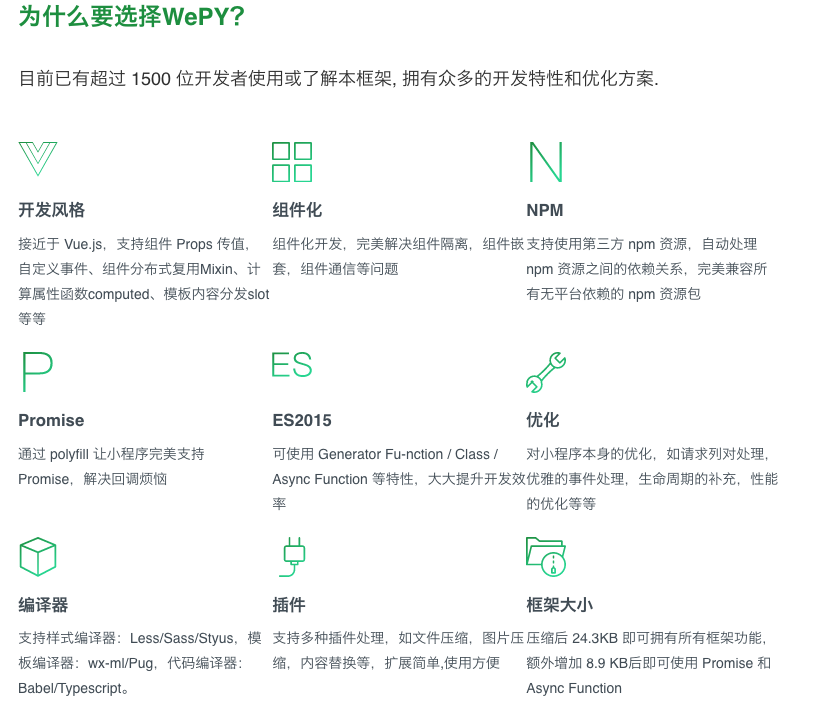 WePY 框架在开发过程中参考了 Vue 等现有框架的一些语法风格和功能特性,对原生小程序的开发模式进行了再次封装,更贴近于 MVVM 架构模式, 并支持ES6/7的一些新特性。