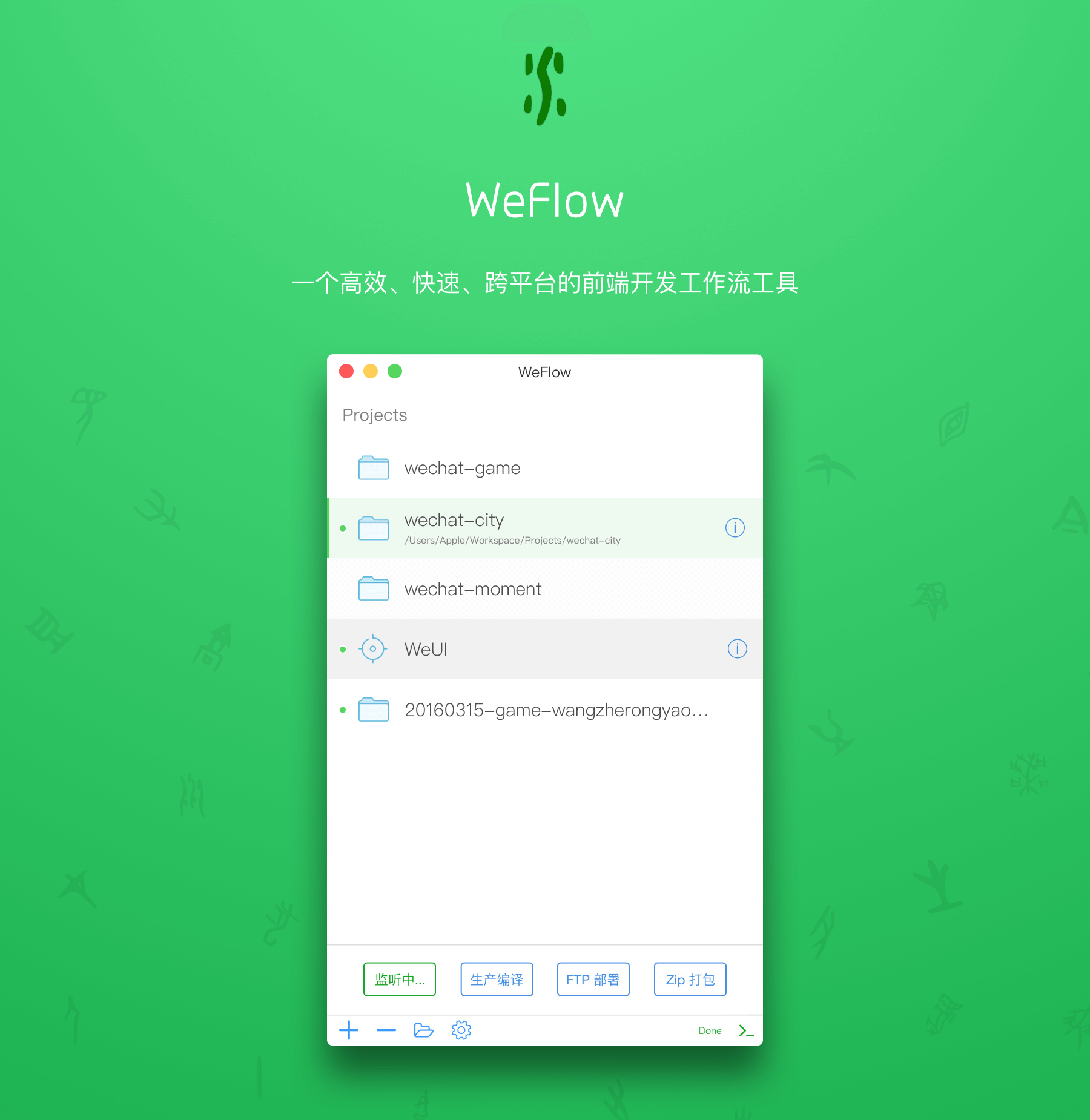 WeFlow 一个高效、强大、跨平台的前端开发工作流工具。目前已支持了:微信游戏、微信·朋友圈广告、微信·城市服务等项目的第三方合作团队的前端构建工作,如果你更习惯命令行操作,可以直接使用 WeFlow 的核心:基于 Gulp 开发的 tmt-workflow :)。