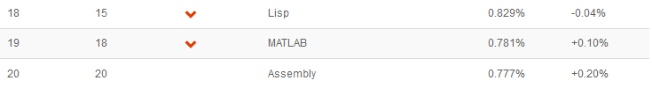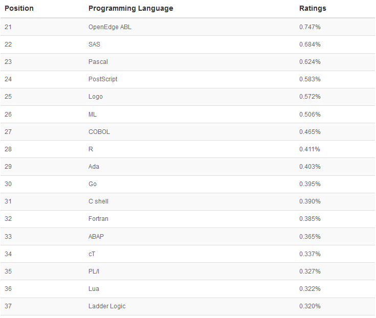由于后 50 名编程语言之间差异比较小,所以这里只列出编程语言名称(排名不分先后)。