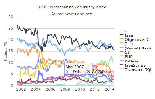 2014 年 7 月 TIOBE 编程语言排行榜发布,前三甲无明显变化,C、Java、Objective-C。