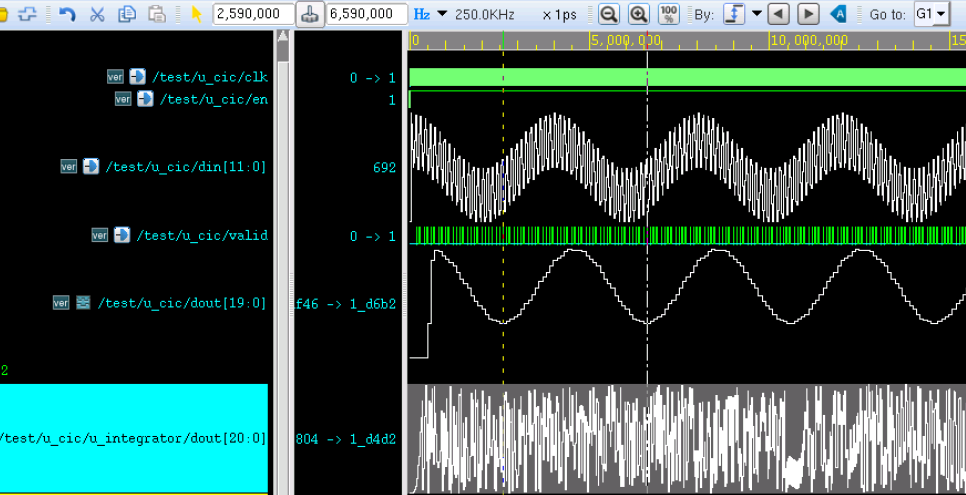 由下图仿真结果可知,经过 CIC 滤波器后的信号只有一种低频率信号(250KHz),高频信号(7.5MHz)被滤除了。