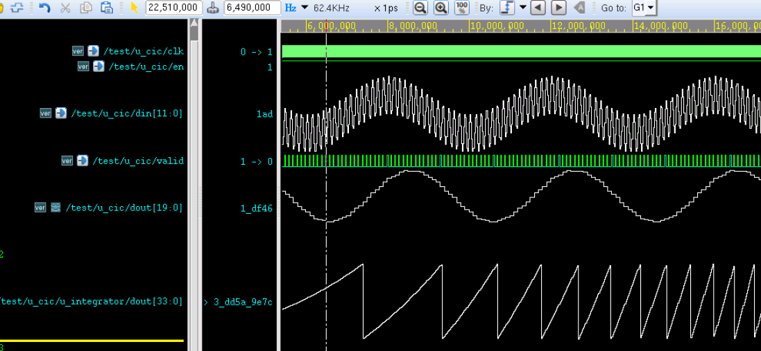 此时发现,积分器输出的数据信号也非常的不规则,这与其位宽有关系。