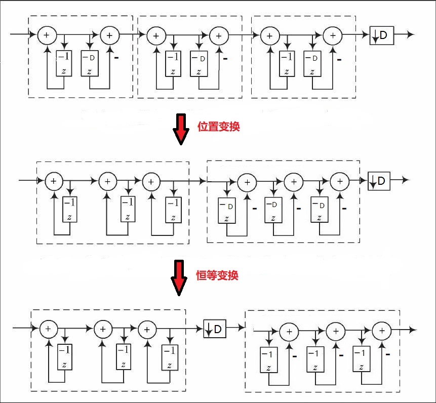 实现多级直接级联的 CIC 滤波器在设计和资源上并不是最优的方式,需要对其结构进行调整。如下所示,将积分器和梳状滤波器分别移至一组,并将抽取器移到梳状滤波器之前。先抽取再进行滤波,可以减少数据处理的长度,节约硬件资源。