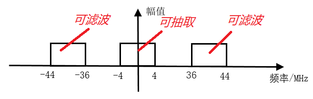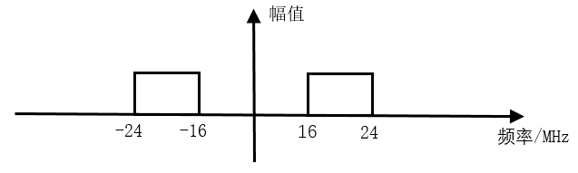 (3)信号经过 20MHz NCO 的正交电路后, -24~ -16MHz 的频带被搬移到 -4~4MHz 与 -44~ -36MHz 的频带处,16~24MHz 的频带被搬移到 -4~4MHz 与 36~44MHz 的频带处,如下所示。