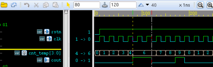 由图可知,在 cnt_temp 等于 4 时(80ns), cnt_temp 被强制赋值为 6,cout 被强制赋值为 1。