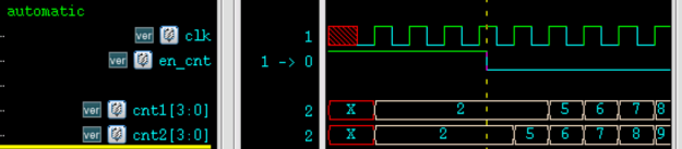 - en_cnt 为低时,任务 (2) 中信号 cnt2 能输出正确的逻辑值,任务 (1) 中信号 cnt1 的值为 X;