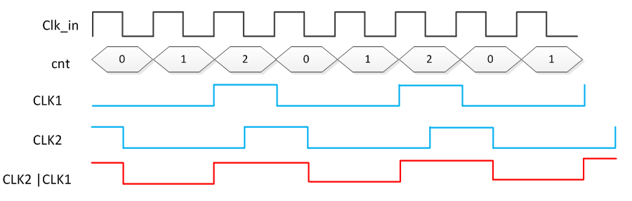 采用"或操作"产生占空比为 50% 的 3 分频时序图如下所示。