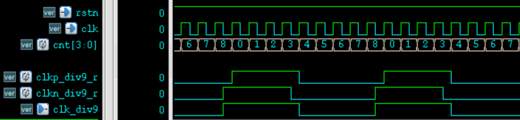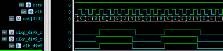 同理,9 分频时,则需要在上升沿和下降沿分别产生 5 个高电平、4 个低电平的 9 分频时钟,然后再对两个时钟做"与操作"即可。Verilog 描述如下。