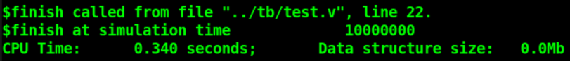 $finish(2),仿真退出时不仅打印仿真时间和行信息,还打印 PC 机使用的时间以及及存储器的使用情况,如下所示。