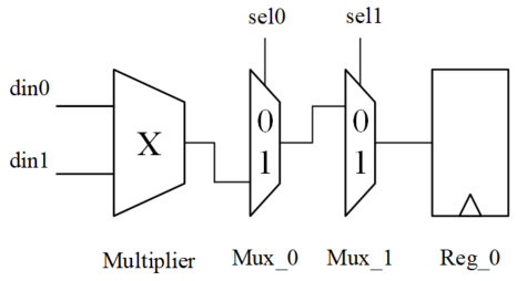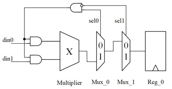 当 sel0 = 0 或 sel1 = 1 时,乘法器 Multiplier 的输出结果并不能通过两个 Mux 到达寄存器的输入端。即寄存器并不能保存当前乘法器的结果,此次乘法运算是没有必要的。在此种条件下,采用操作数隔离,使乘法器不工作保持静态,也可以节省功耗。