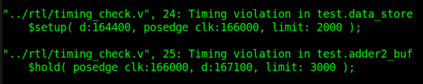 仿真报告中则出现了带有 setup/hold violation 的打印信息,部分截图如下。