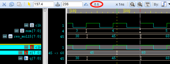 例如,将上述仿真中的工作时钟周期由 10ns 改为 20ns,则不会出现 setup violation。