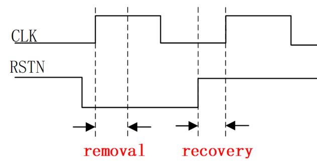 复位时,复位信号在时钟有效沿来临之后,还需要在一段时间内保持不变,这段时间为 removal time。类似于同步时钟下触发器的 hold time。