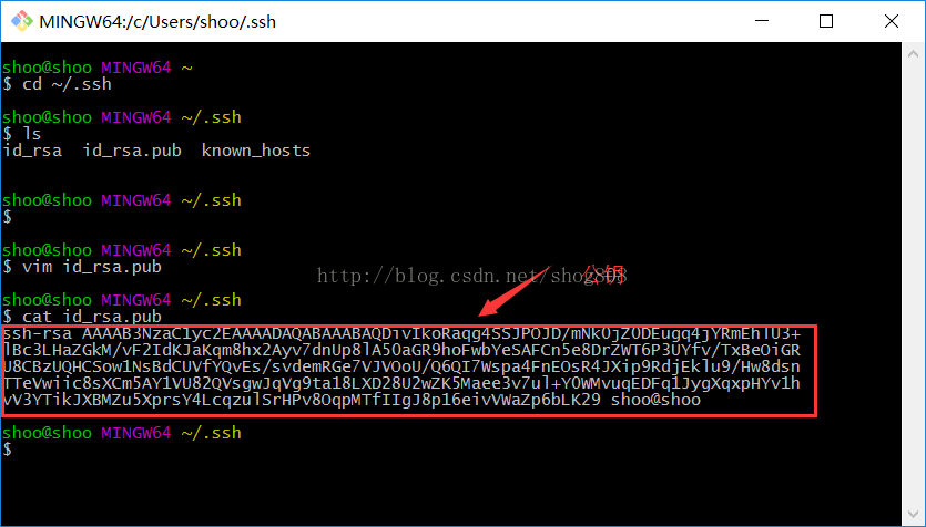 2.或者你也可以直接输入命令 :cat ~/.ssh/id_rsa.pub