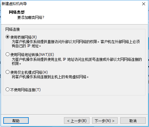 8.网络连接类型的选择,网络连接类型一共有桥接、NAT、仅主机和不联网四种。