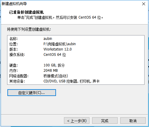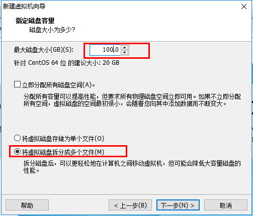 磁盘容量暂时分配100G即可后期可以随时增加,不要勾选立即分配所有磁盘,否则虚拟机会将100G直接分配给CentOS,会导致宿主机所剩硬盘容量减少。 勾选将虚拟磁盘拆分成多个文件,这样可以使虚拟机方便用储存设备拷贝复制。