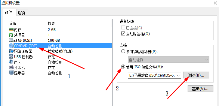 先选择CD/DVD,再选择使用ISO映像文件,最后选择浏览找到下载好的镜像文件。启动时连接一定要勾选上后确定。