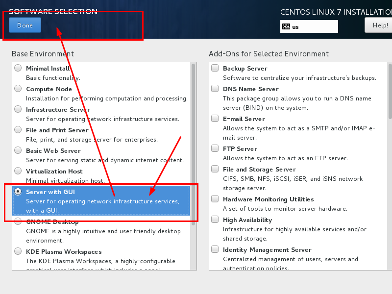 选择 Server with Gui,然后点击Done
