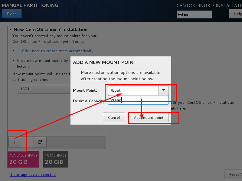 如下图所示,点击加号,选择/boot,给boot分区分200M。最后点击Add