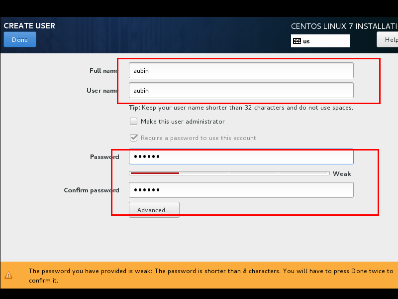 首先要打开网卡,然后查看是否能获取到IP地址(我这里是桥接),再更改主机名后点击Done。