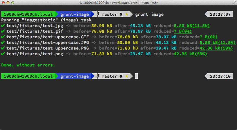 grunt-image非常强大,按照作者的介绍,其内部加载的图片优化工具包括了pngquant, optipng, advpng, zopflipng, pngcrush, pngout, mozjpeg, jpegRecompress, jpegoptim, gifsicle和svgo。支持批量自动优化PNG, JPG, SVG和GIF,速度也不错,配置方式支持单图片优化和全目录优化: