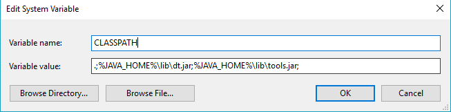 变量名:CLASSPATH 变量值:.;%JAVA_HOME%\lib\dt.jar;%JAVA_HOME%\lib\tools.jar;
