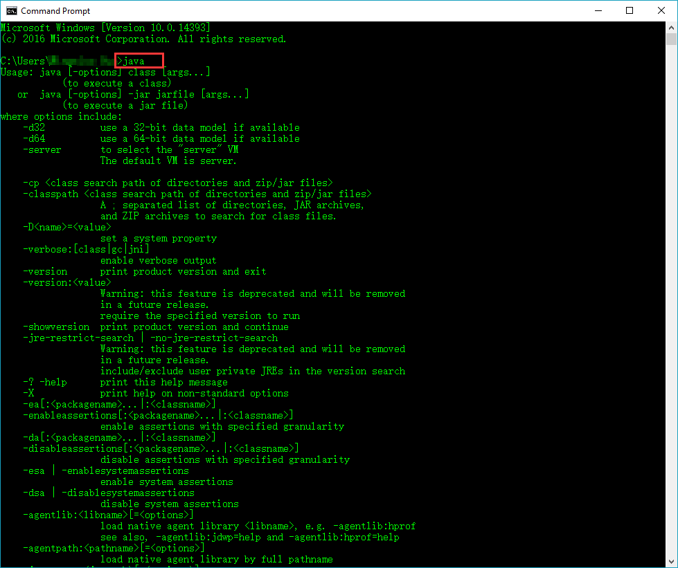 4. 检查 打开 cmd,输入 java,出现一连串的指令提示,说明配置成功了: