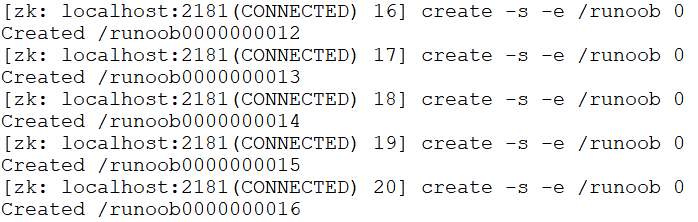 $ ls /runoob $ create /runoob/child 0 $ create /runoob/child/ch01 0