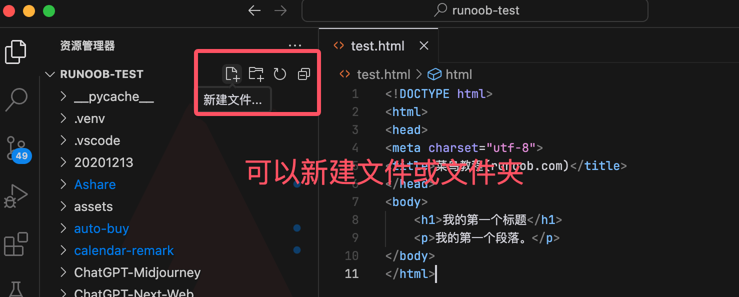 我们也可以打开一个已存在的文件或目录(文件夹),比如我们打开一个 runoob-test,打开该目录后,它就会显示在资源管理器中: