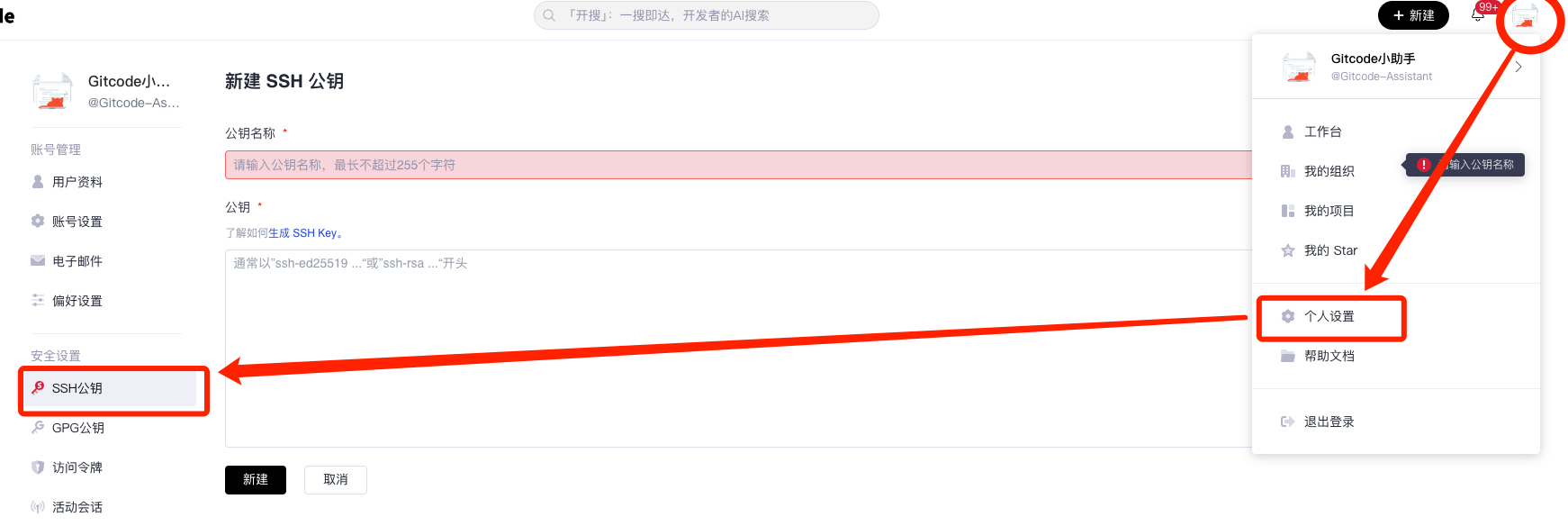 - 登录到你的 GitCode 账户,进入"个人设置"页面,找到"SSH 公钥"部分。