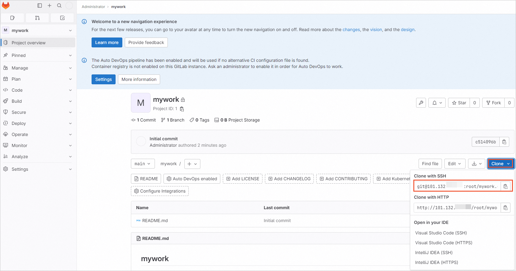 复制 Clone 链接,该链接在进行克隆操作时需要使用: