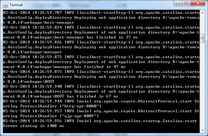 接着我们可以双击 startup.bat 启动 Tomcat,弹出如下界面: